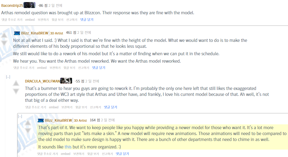 다시 만든다니 실망스럽군요. 저는 아마 아서스, 우서가 그렇듯 워크래프트3 아트 스타일의 과장된 표현을 좋아하는 여기 남은 유일한 사람일텐데요, 솔직히 말해서 전 지금 아서스 모델이 좋아요.