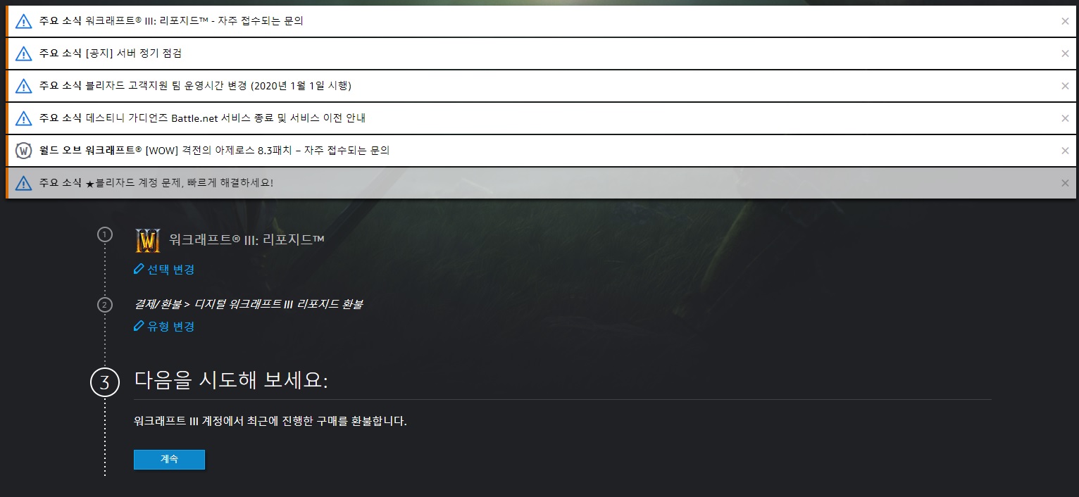 덤으로, 워3 리포지드의 자동 환불 링크가 추가되었습니다. 자동 환불을 하게 되면 다른 게임 보상(예를 들어 와우 고기 수레 탈것 등)도 잃게 됩니다.