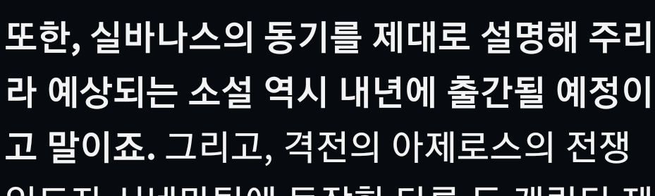 "그녀의 미래" 라는 말을 감안하면, 어쩌면 당연하게도 실바나스는 살아남아 향후 패치에도 어떤 역할을 맡게 될 것으로 보입니다. 또한, 실바나스의 동기를 제대로 설명해 주리라 예상되는 소설 역시 내년에 출간될 예정이고 말이죠. 그리고, 격전의 아제로스의 전쟁인도자 시네마틱에 등장한 다른 두 캐릭터 제이나와 아즈샤라 역시 공격대의 마지막 우두머리로 등장했지만살아남았다는 것을 감안하면, 실바나스의 이야기 역시 공격대 그 이후로도 계속되는 것이 당연지사일지도 모릅니다.