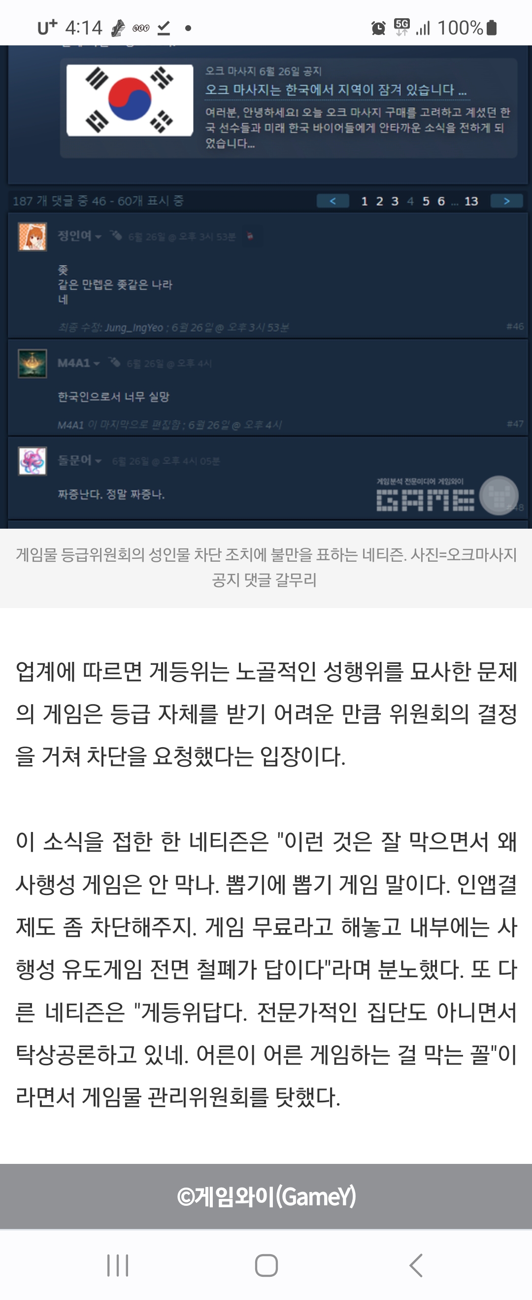 https://www.gamemeca.com/view.php?gid=1683468 밸브의 오크 마사지 관련 답변 내용을 보면 아시겠지만 게임위에서 심의나 받으라고 한게 아니라 직접적으로 차단 요청한게 맞습니다. | 22.10.14 17:59 | | |