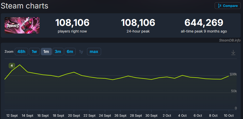 지역별 접속 시간 차이와 "오버워치 2"의 시즌 시작이라는 변수가 있기는 합니다. "마블 라이벌스"가 여전히 매일 "오버워치 2"보다 높은 동접자 수를 기록하는 것도 맞습니다. 그러나 그 격차는 계속 줄어들고 있으며, "마블 라이벌스"는 시간이 지날수록 빠르게 동력을 잃어가고 있습니다. "마블 라이벌스"는 2024년 12월 출시 후 한 달 뒤인 2025년 1월에 동시 접속자 64만 4천 명으로 정점을 찍었습니다. 하지만 2025년 8월 현재, 시즌 시작이나 신규 캐릭터 출시로 일시적인 상승이 있었음에도 불구하고, 오늘 24시간 최고 동접자 수는 9만 1천 명에 그쳤습니다. 이는 8개월 만에 85%나 감소한 수치입니다.
