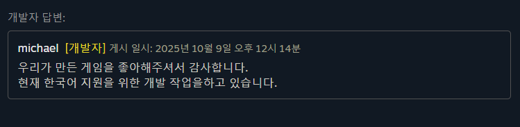 유저 한글화 패치가 있긴한데 9월부터 한글화 이야기 한거 보면 그래도 몇달안에 나올거같은게 최근 한달에 하나씩 뭘 게속 업데이트 하고있으니 연말이나 연초에 소식있을듯? | 25.11.23 18:28 | | |