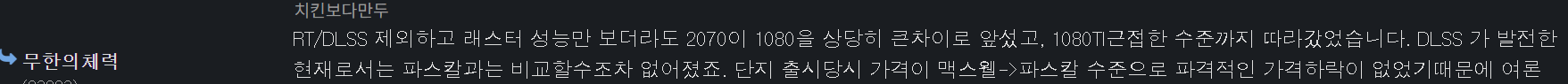 문제는 그 시점에서 2070의 가격이 MSRP부터 "패륜적"이어서 실 구매가가 1080ti랑 맞먹고 있었다는 점이죠. 라고하셨는데, 옛날 그런식으로 주장하던 인간들 대상으로 내가 팩트체크 한 내용도 있으니 참조. MSI 동일 등급 제품 실구매가 기준 1080TI는 커녕 1080과 비슷하거나 더 저렴했음. 저런식으로 의도적으로 까내리기 한 암등이들때문에 이미 당신같은 사람들은 세뇌가 되버리신듯. https://bbs.ruliweb.com/pc/board/300006/read/2167642#ct_39764491 | 26.03.20 11:11 | | |