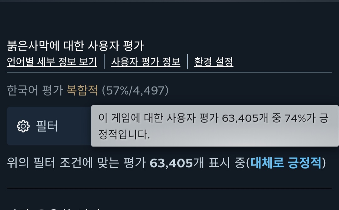 인터넷 게시글만 보지말고 실제 스팀들어가서 모든 국가 평가보면 한국어 평가 57프로 복합적이고 전체는 74프로 대체로 긍정적이야 남들이 욕하니간 우르르 몰려가서 욕하지 말고 직접 가서들 확인을 좀 해라
