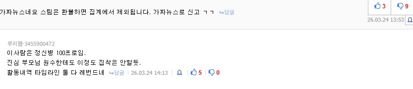글을 읽고 댓글 달아보는건 어떠니 반대로 말하고 있단다 | 26.03.24 14:44 | | |