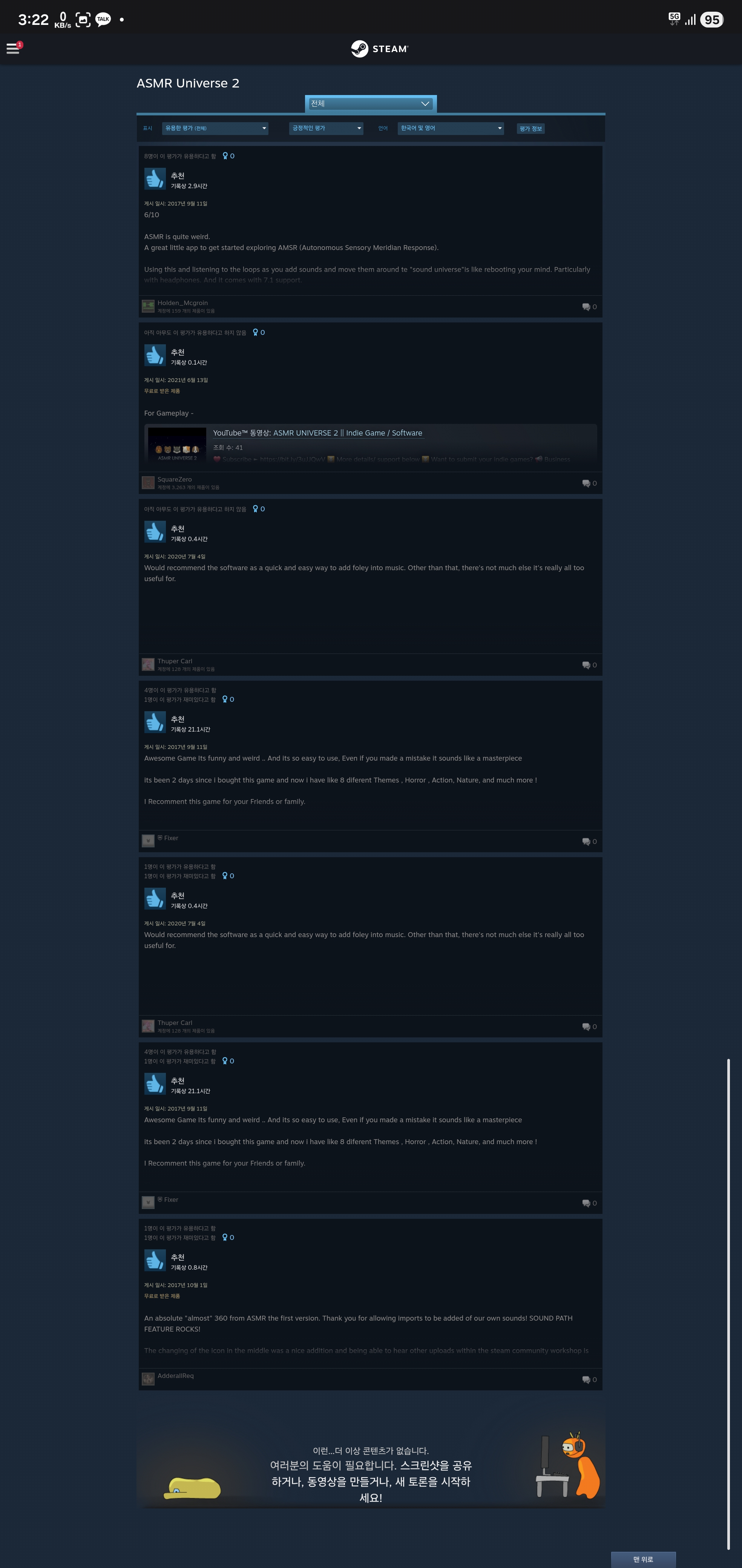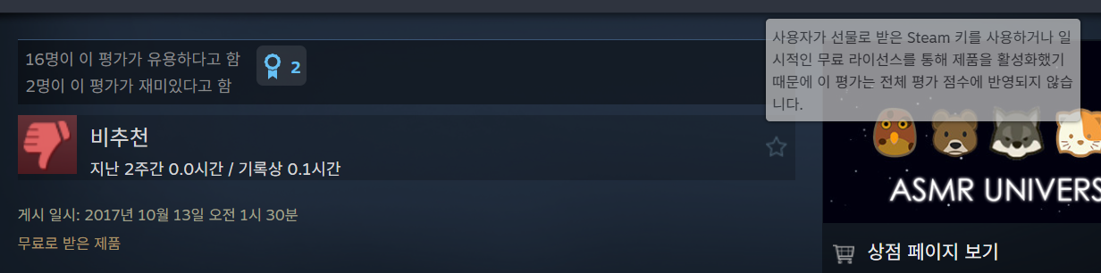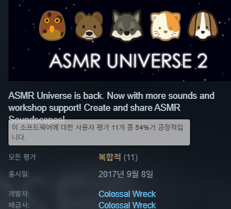 https://store.steampowered.com/app/690280/ASMR_Universe_2/#app_reviews_hash 진짜 미치고 팔짝 뛰겠네 그냥 여기서 스팀으로 구매된 리뷰11개중 긍정6 부정4, 환불된 부정1 있는 게임이니까 직접 세서 더해지는 지 알아서 확인해 | 26.03.24 14:48 | | |