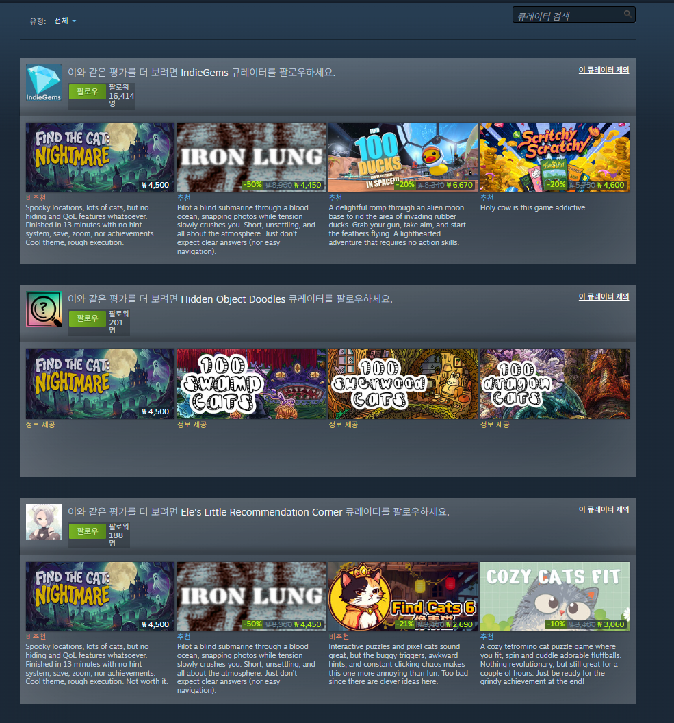 제가 드린 유저 빼고 집계하면 4개의 긍정리뷰, 5개의 부정리뷰, 1개의 환불된 부정리뷰 이게 안되나요? 여기서 갑자기 님이 큐레이터리뷰는 빠진다고 하니 그냥 그 리뷰 들어가서 별표시 있는지 보세요. 빠지는지 안빠지는지 스팀이 알려줍니다. | 26.03.24 17:53 | | |