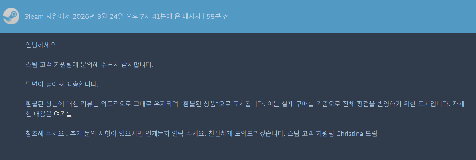 네 그리고 지금 반영 안된단 근거로 제시된 게임들은 리뷰 자체가 너무 적어서 환불에 대한 알고리즘이 만약 있다면 동작 안해서 그런걸 수도 있구요 사실 그건 스팀 개발자만 알 수 있겠죠 ㅋㅋ | 26.03.24 17:30 | | |
