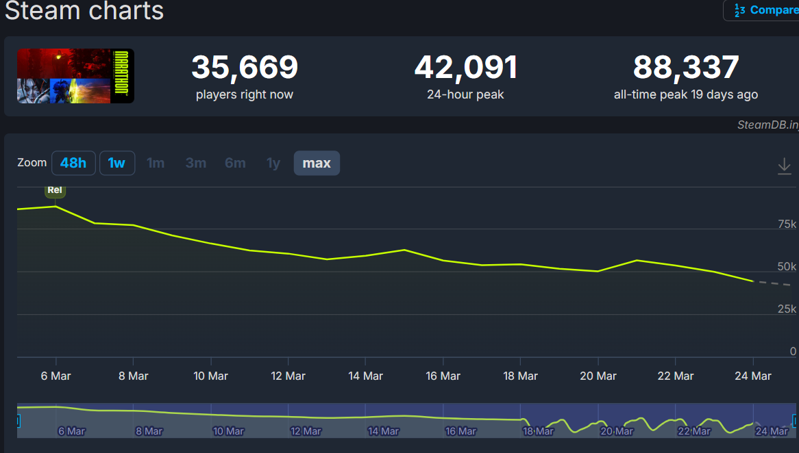 절반도 안되요. 피크때도 1/3정도 거나 그 이하. 문제는 그 4만명 언저리 접속자도 전체 판매량에서 70%라는 스팀판이라는거. 그냥 게임 자체가 서서히 말라죽어가고 있는 중인대 시즌인가 뭔가 열리면 평가해달라는게 웃긴상황이죠. | 26.03.25 19:43 | | |