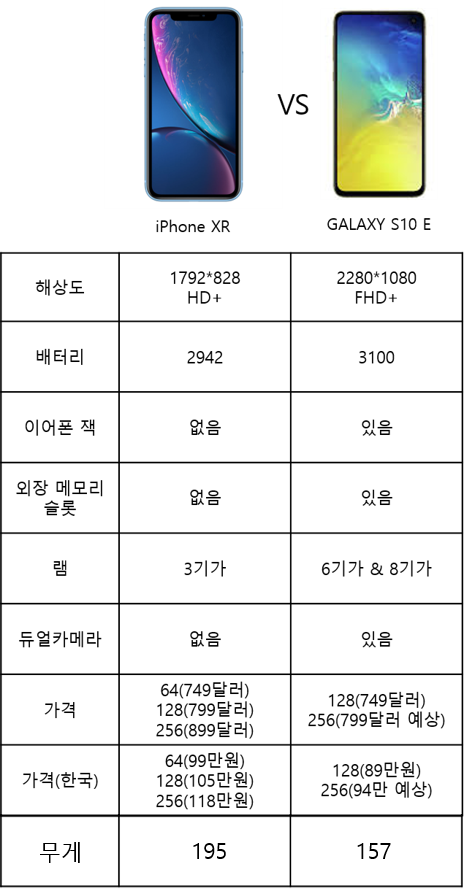 10e가 아이폰xr과 비교하면 그저 최소 램 2배로 많고 배터리도 더 많고 픽셀수도 2배 좀 안되게 많고 무게는 25%정도 가볍고 후면 카메라도 1개 더 많고 기본 내장 메모리 용량도 2배에 이어폰잭도 있고 sd슬롯도 있고 10만원쌀뿐입니다