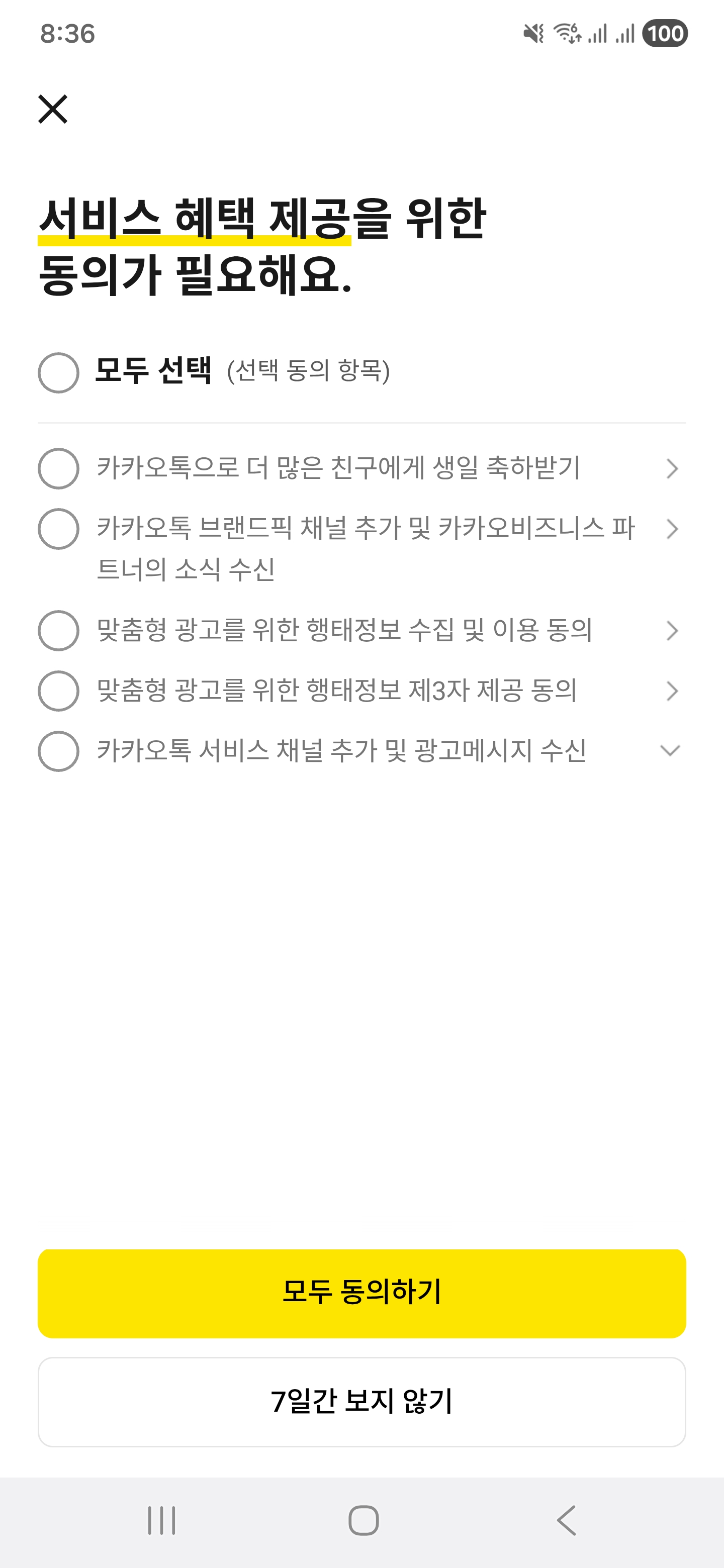 카카오 선물하기 적자난거 복구 하려고 페이지 이동할 때 선택동의 구걸함. 동의 안하면 계속 뜸, 7일 거부하기 있는데 7일뒤에 또 뜸 ㅋㅋㅋㅋ 야이 쌍쌍바들아!!!