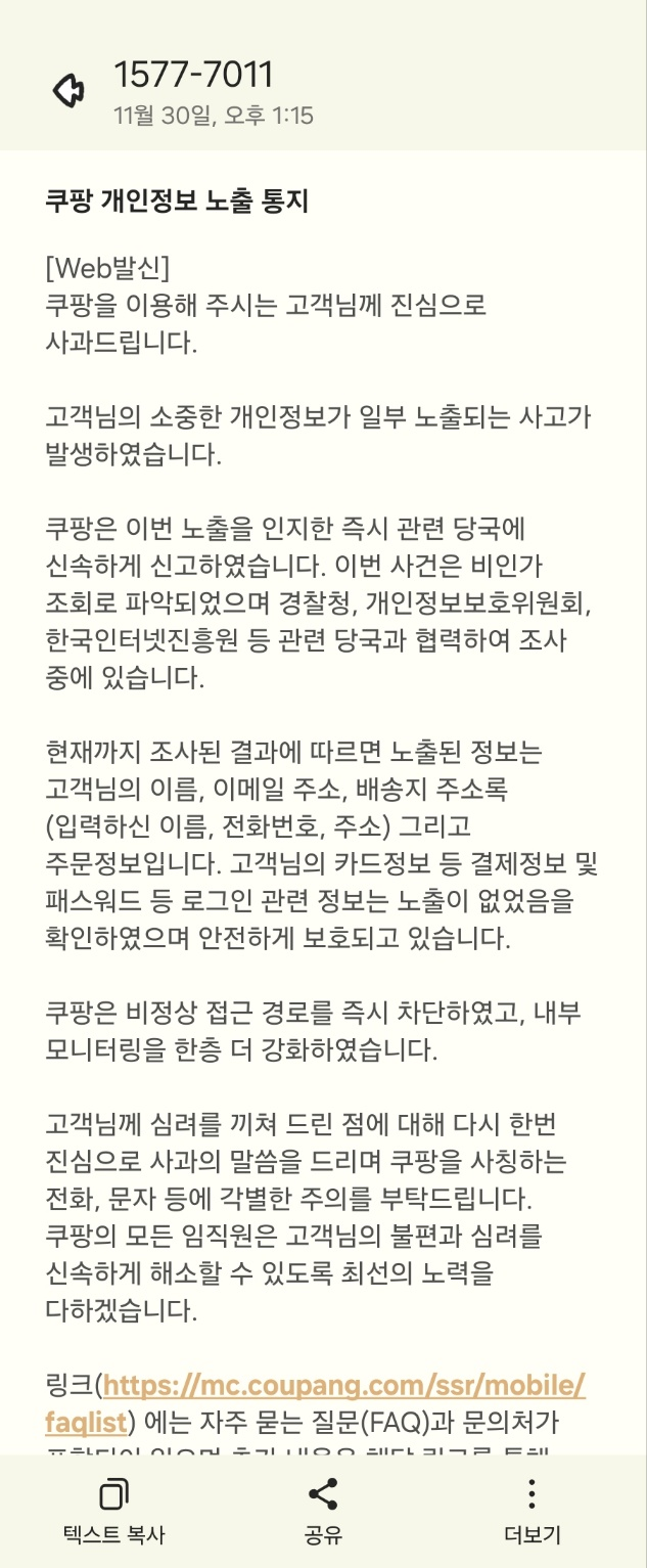 아까 온 쿠팡 문자임 담당자 책임자 처벌이나 사후대처는 어떻게 할지 뭐 영양가 있는 내용은 하나도 없음 진짜 징벌적 손해배상 마렵다 배상은 필요없고 처벌이나 쎄게 맞았으면 좋겠네