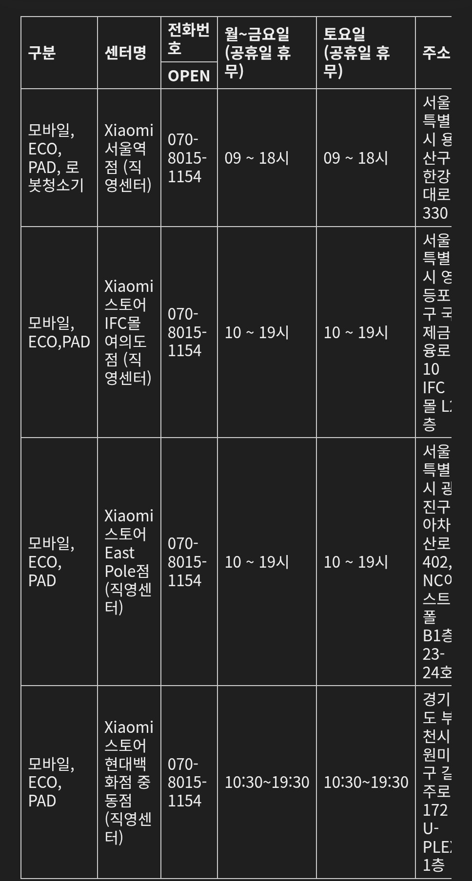 그런건 보통 직영센터를 늘린다음에 해야하지 않을까요. 샤오미 공식홈페이지에서 보니깐 직영센터가 서울 3개, 경기도 1개 밖에 없네요. | 25.12.02 16:49 | | |