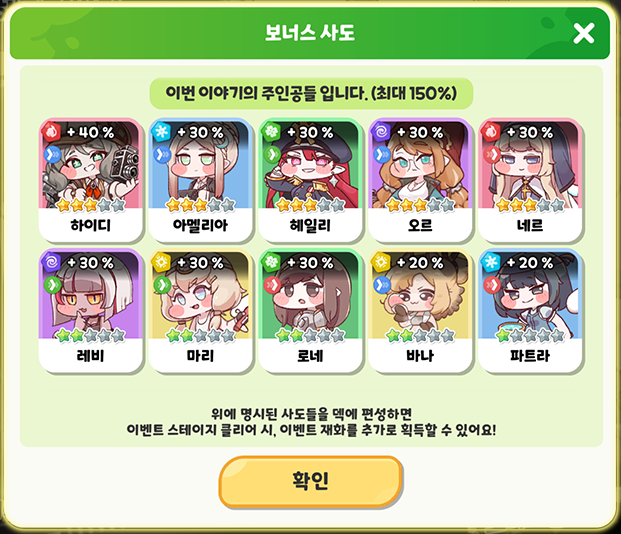 면제 보너스 비율의 경우 보너스 사도 편성 변경 후에 스테이지를 재클리어 시 변경됩니다.