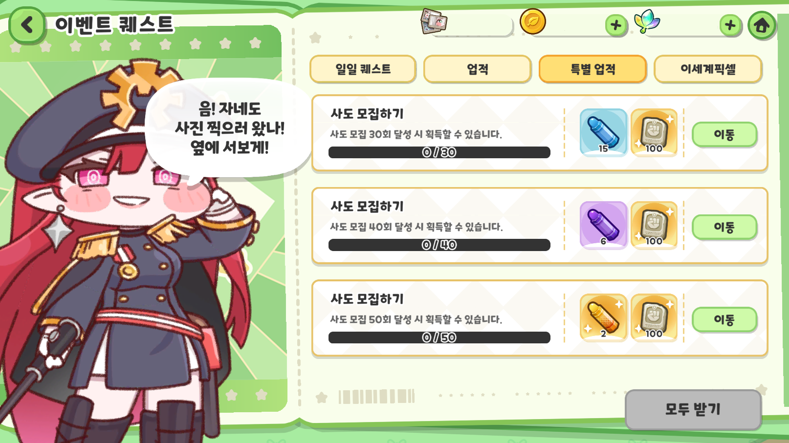 ※ 사도 모집 달성 횟수는 초보자, 픽업, 일반, 스페셜 픽업, 소셜 모집이 모두 포함됩니다. ※