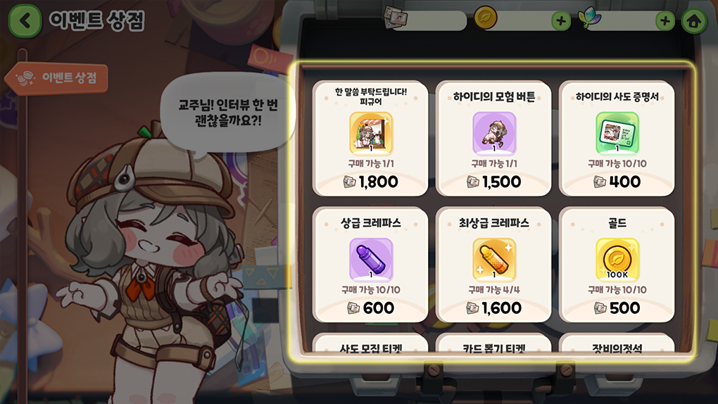 획득한 이벤트 재화를 사용하여 다양한 아이템과 움직이는 하이디 피규어를 교환할 수 있습니다.