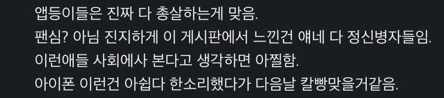 삼성 하나 깠다고 총살에 칼빵에… 전 다른 사람들보다 님이 더 무섭네요. 핸드폰이 전부는 아닙니다, 과몰입 하지 맙시다 거. | 26.01.06 05:11 | | |