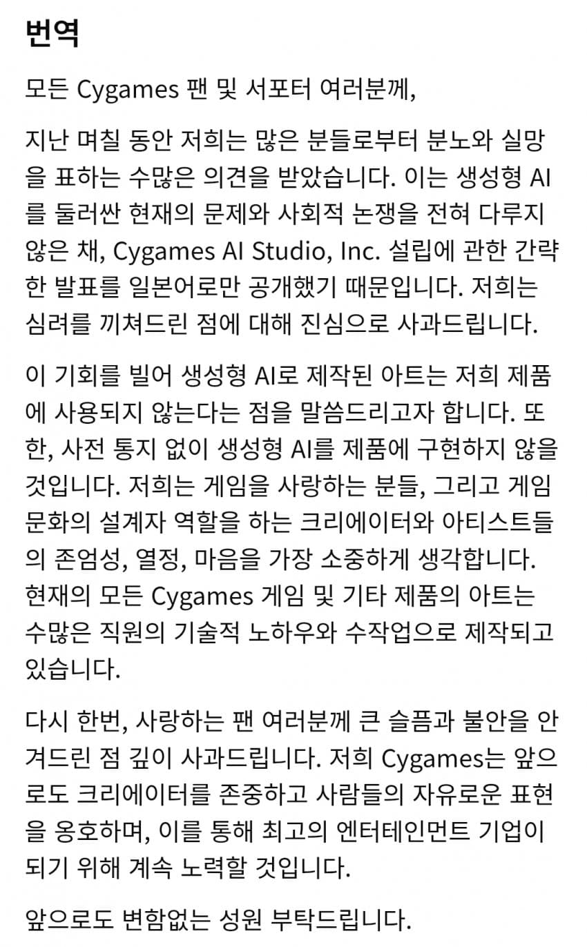 일어쪽은 「무단으로 이미지 생성형 AI의 생성물을 콘텐츠에 사용하는 일을 하지 않을겁니다.」 영문과 뉘앙스는 유사한걸로 보이네요 본문에 전문에 대한 번역이 없어 올린 부분이니 참고용으로 보시면 됩니다. | 26.01.14 23:13 | | |