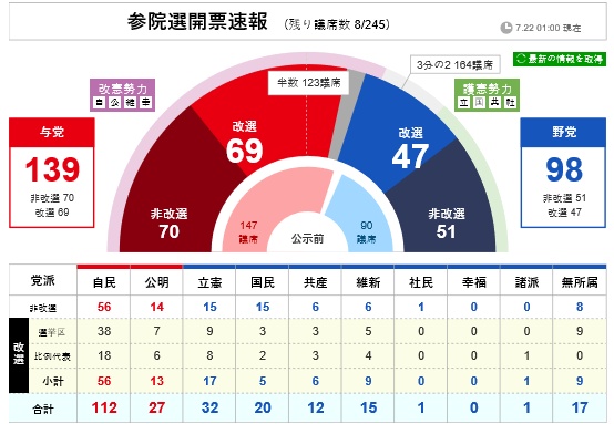 일본 자민당 과반수 확보야 엥간하면 기정 사실이었고. 이번 아베 공약이 평화헌법 개헌이었음. 목표 실패로 봐야함. | 19.07.22 01:02 | | |