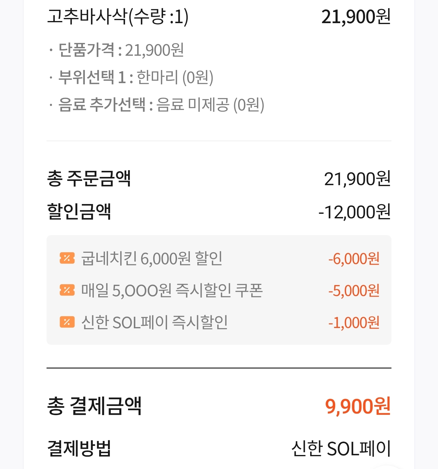 12900원 (고추바사삭1000원 + 다리3000원 추가) 결제 했네요.... | 25.10.10 16:12 | | |