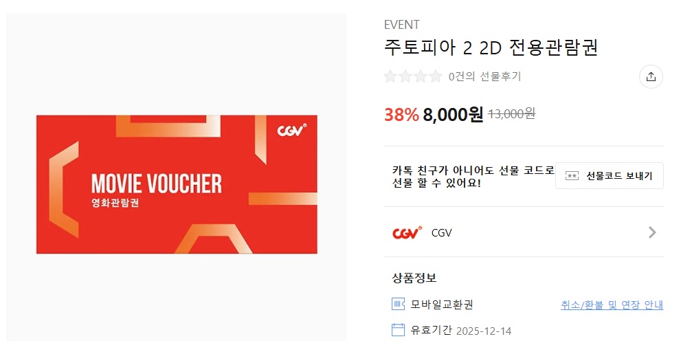 본 상품은 CGV 개봉영화 <주토피아 2> 2D 전용관람권입니다.