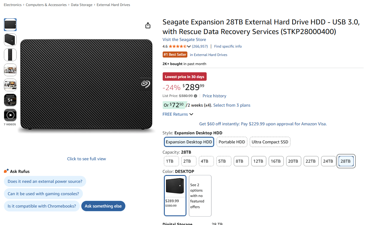 시게이트 28테라가 역대가로 나오긴 했는데요 평소 320달러정도 했었습니다.
