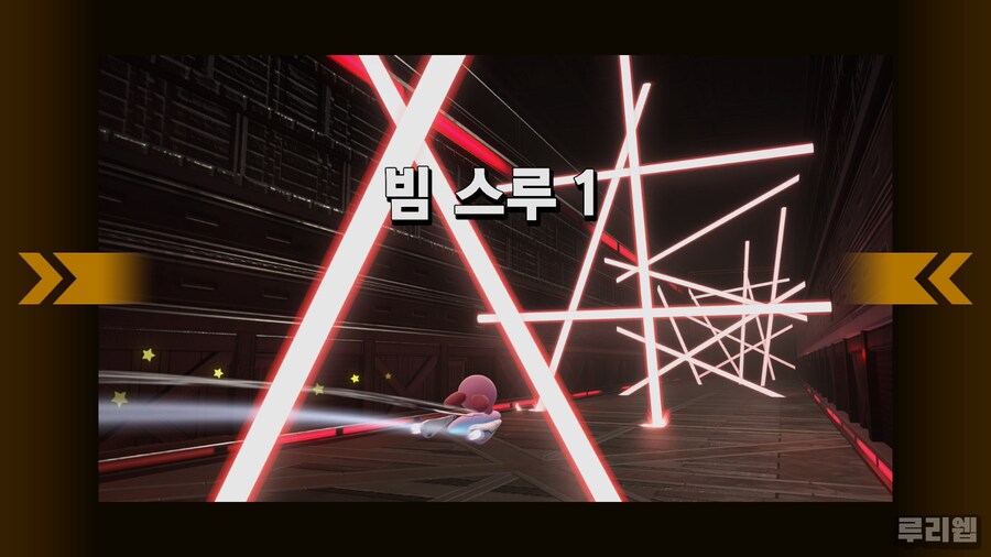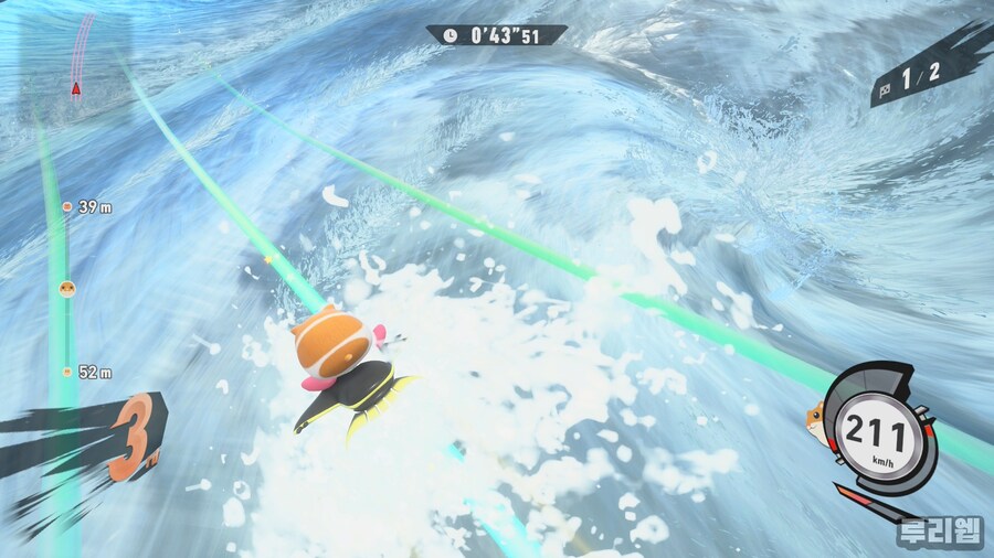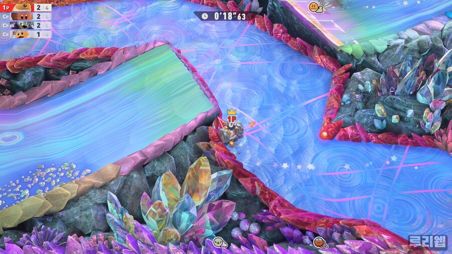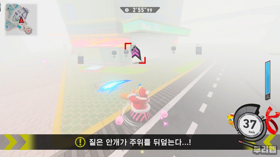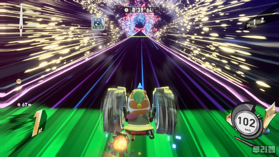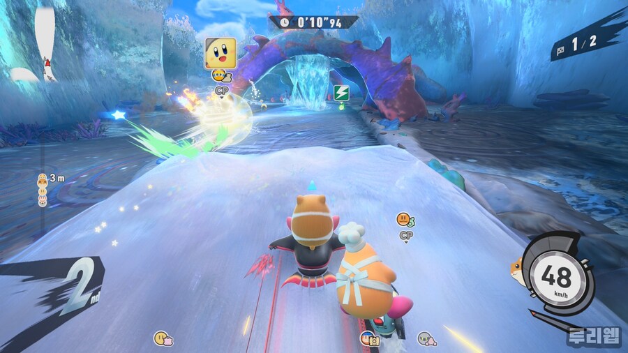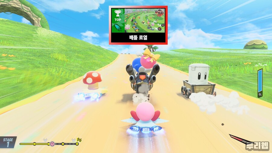 그럼에도 하이 라이드가 보여줬던 근간은 유지된다. 하이 라이드의 특징을 정리하자면, 더 간편하고 짧게 즐길 수 있는 레이스 / 카피 능력 대신 일회성 아이템이 등장 / 위에서 바라보기에 다른 플레이 감각을 구현하는 것이다. 아주 간단하게 짧은 시간에 레이스를 즐길 수 있고 총 9개의 코스가 가지고 있는 기믹들이 나름의 즐거움을 만든다.