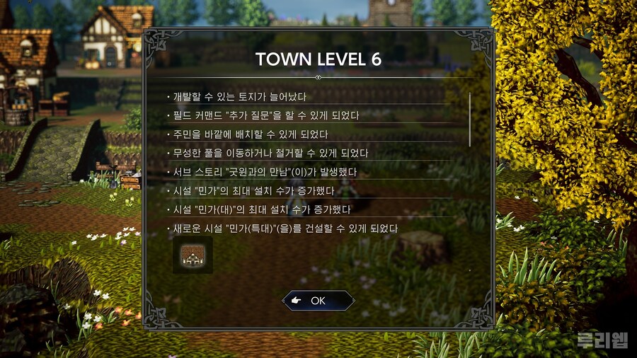 마을 스토리를 클리어 하면서 레벨이 오르고 기능이 늘어나는 구조다