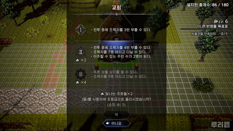 필드에 있는 보스 몬스터를 잡고 얻는 빛나는 주춧돌은 남겨두도록 하자. 교회에서 얻는 기능이 우선이다