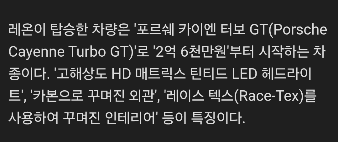 저도 육안으로는 잘 구분이 안 되는데, 카이엔이라고 적혀 있네요ㅎㅎ | 25.12.15 07:49 | | |
