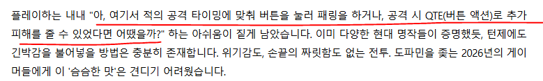 - 리뷰 내용 중 플레이하는 내내 "아, 여기서 적의 공격 타이밍에 맞춰 버튼을 눌러 패링을 하거나, 공격 시 QTE(버튼 액션)로 추가 피해를 줄 수 있었다면 어땠을까?" 하는 아쉬움이 짙게 남았습니다 네 33빠였음 | 26.02.03 11:12 | | |