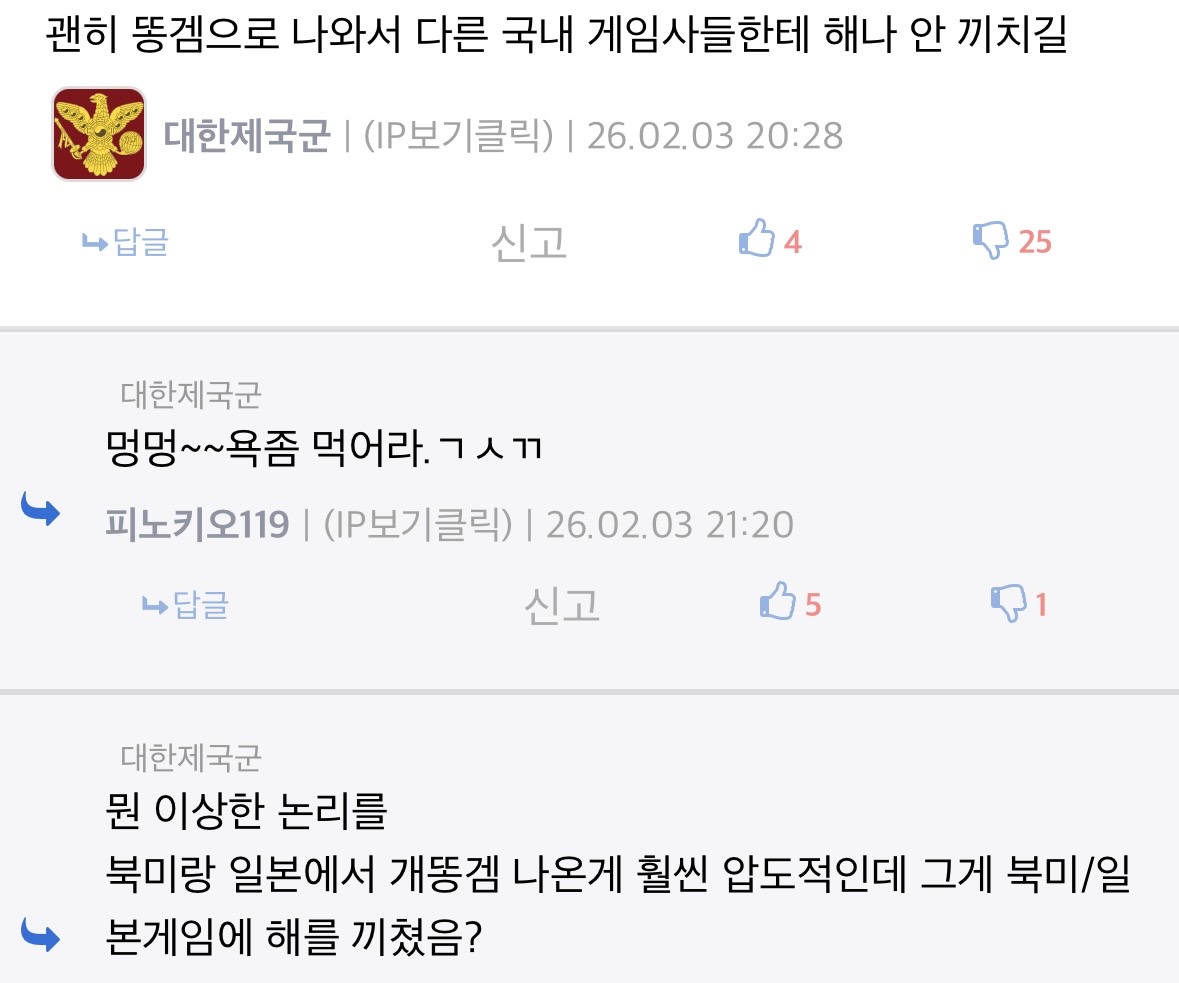 보통 주식 고점에 물린 사람들이 이 겜 성공하라고 억빠 하고 다니지 않음? 매일 주가 폭등 했다는 댓글 달고 다니던데 | 26.02.04 00:42 | | |