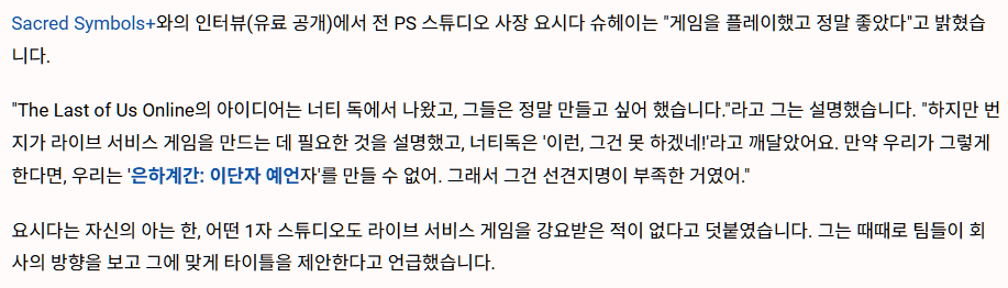 일각에서는 블루포인트가 먼저 그 프로젝트를 제안했을 거라고 말하지만, 설령 그렇다 하더라도 소니가 '라이브 서비스' 게임이 아니면 결재조차 안 해주는 분위기를 조성했을 가능성이 큽니다. 백번 양보해서 제안을 했다 쳐도, 경영진이라면 당연히 앞날을 내다보고 그 제안을 반려했어야죠.