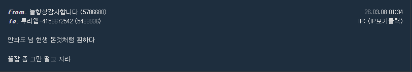 나를 아는것처럼 말하네? 내가 누군지 어떻게 알고 그런 모욕을 또 주니? 이러니까 내가 너한테 정신 차리라고 말해주는거야 | 26.03.11 17:41 | | |
