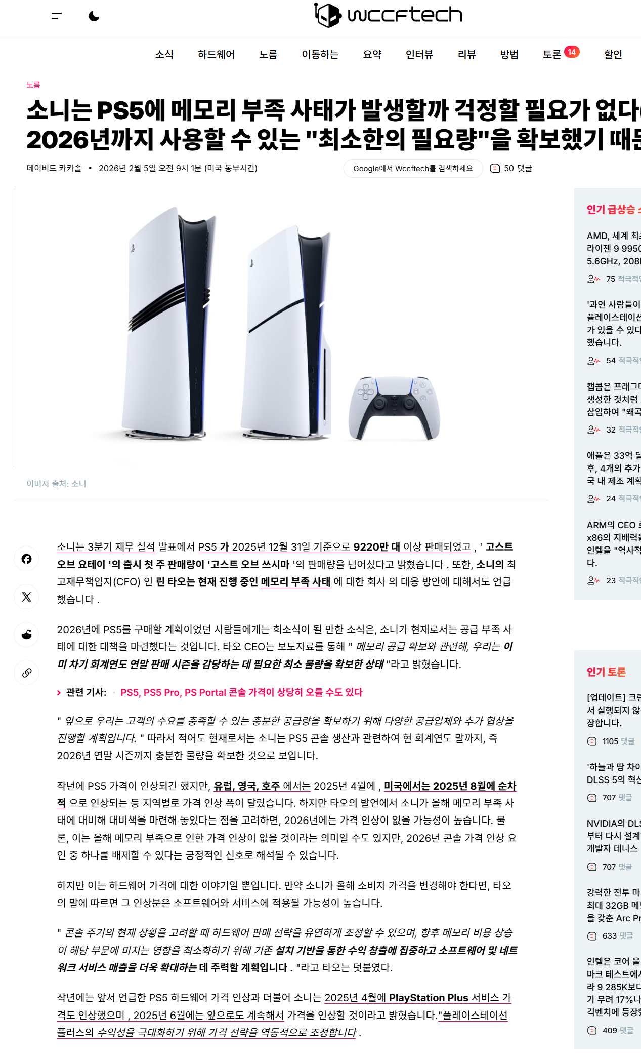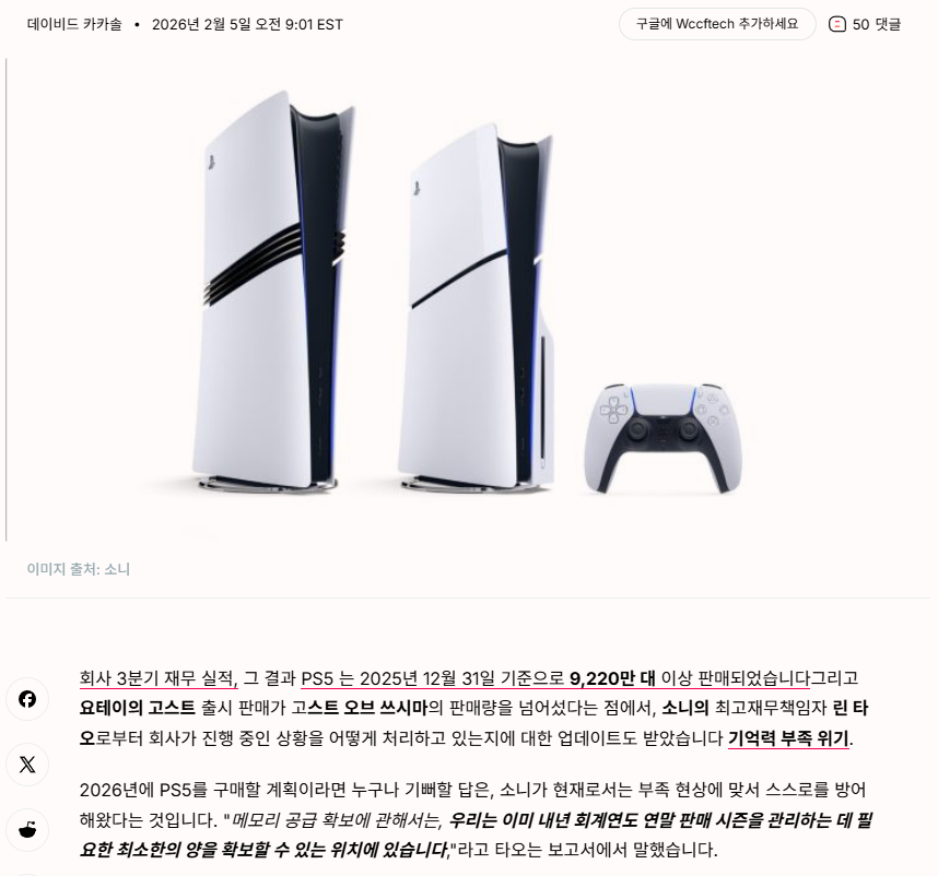 "메모리 공급 확보에 관해서는, 우리는 이미 내년 회계연도 연말 판매 시즌을 관리하는 데 필요한 최소한의 양을 확보할 수 있는 위치에 있습니다,"라고 타오는 보고서에서 말했습니다. "앞으로도 고객의 수요를 충족할 수 있을 만큼 충분한 공급을 확보하기 위해 다양한 공급업체와 추가 협상을 진행할 계획입니다." https://wccftech.com/sony-memory-shortages-ps5-ps5-pro/ 그게 기레기들 낚시잖아요 저 기사의 제목만 봐도 메모리 확보를 했다고 나오는데 막상 내용을 읽어보면 확보를 한게 아니라 노력하고 있다는 뜻이잖아요 | 26.03.27 11:25 | | |