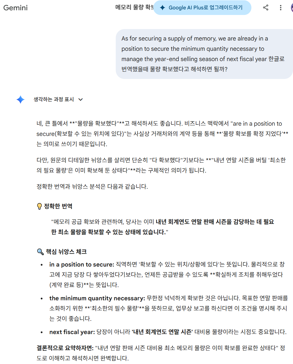 확보할 위치에 있다 이 뜻을 모르세요? 비즈니스 보고나 회의에서 이 문장을 쓰였다면 어떤 뜻으로 쓰이는지 모르시나요? 연말 성수기 물량 걱정은 안 해도 된다 최소치는 이미 보장되었다 뭐 이런 확신을 주는 표현이라구요 아니 "영어"원문을 해석해야지 일어를 해석해서 뭘할건가요? 빙 번역이 번역률이 좋을까요? 구글 번역기가 번역률이 좋을까요? 직역이랑 의역의 차이를 모르시나요? 님이 말하는건 "직역"이고 빙,네이버번역의 "직역"으로 확보한거 아니라고 우기면 뭐 뜻이 달라지나요? 하~... 진짜 답답하시네 | 26.03.27 12:13 | | |