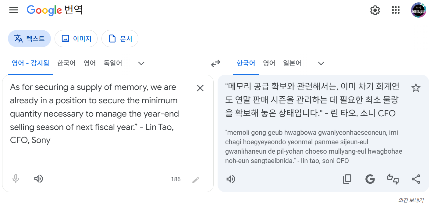 As for securing a supply of memory, we are already in a position to secure the minimum quantity necessary to manage the year-end selling season of next fiscal year 이건 확보했다고 번역을 해야되는 부분입니다 확보할 수 있는 위치에 있다 / 확보 할수 있는 상태다 / 확보 가능한 상황으로 해석할 수 있고 연말판매시즌을 위한건 확보를 했고 그이후 앞으로 추가협상에 대한걸 말하는거죠 | 26.03.27 11:31 | | |
