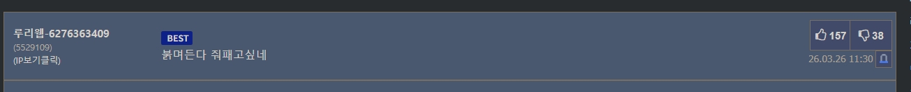 정치적인 얘기는 아닌데 ㅇㅂ나 이런 애들이 그런쪽이고 뉴스나 기사 또는 유튜브에 그런쪽이 인간 쓰레기장이라서 그렇게 제가 색안경 껴있나봐요.^^ 뭐 돌아이든 어디든있죠. 다만 비율적으로 | 26.03.27 12:30 | | |