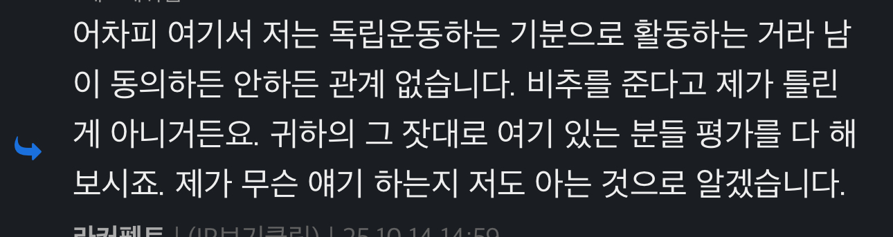 뜬금없이 독립운동을 내가 얘기했다고??? 저위에 캡쳐글은 님이 쓴거아님? 독립운동하는 기분으로 여기서 활동한다고 님이 썻잖슴?? 와 진짜 왜이러는거지??? | 25.10.27 16:27 | | |