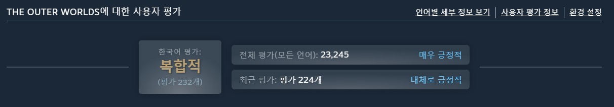 아우터 월드가 특이한 게 스팀 전체로는 '매우 긍정적'인데 유독 한국인들 평가가 나쁨. 오직 한국어 평가만이 복합적이고 나머지 언어들은 전부 대체로 긍정적 이상임. 한국인 게이머들이 특별히 PC에 적대적인 건지, 아니면 게임이 한국인들을 긁는 뭔가 있는 건지 모르겠음.