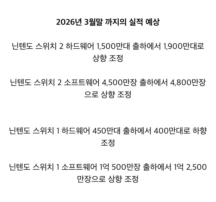 닌텐도 예상보다 잘팔려서 실적 예상 상향 조정 되었습니다 | 26.01.15 04:55 | | |