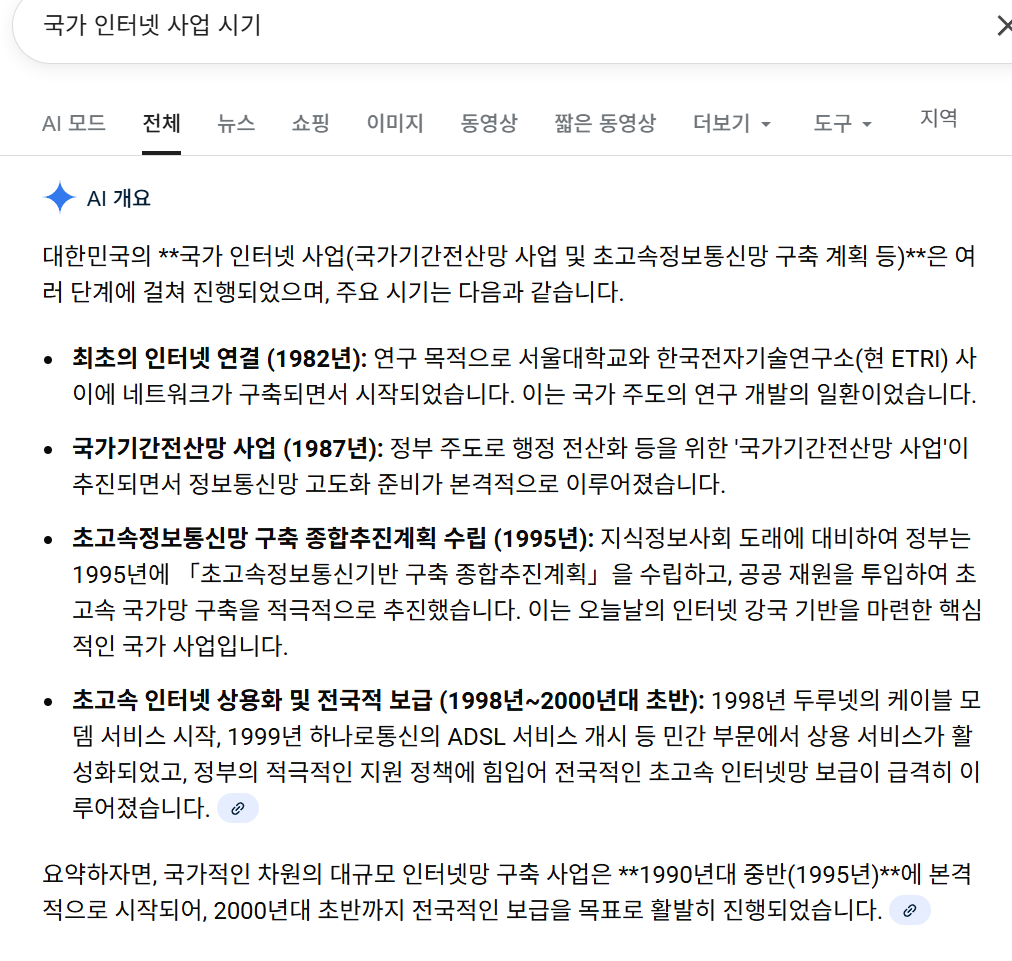 인터넷 사업 깔아 준 시기는 IMF와 관련되어 있으며,이것을 한 이유는 국가서업으로서 IMF극복을 위해서 세금으로 낸 것이다. 먼 개인이고, 기업이야. 이후 KT(한국전기통신공사)민영화는 2002년 8월이다. | 25.11.14 20:23 | | |