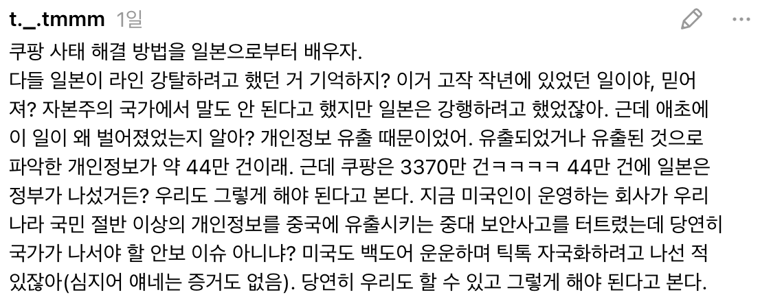 지금 문제는 쿠팡의 보안이 취약한 문제인거 아님? 자꾸 중국인에 초점을 맞춰봐야, 기업에 중국인 뽑아라 내국인 뽑아라 등 감놔라 배놔라 할 수 있냐는거임 | 25.12.05 09:38 | | |