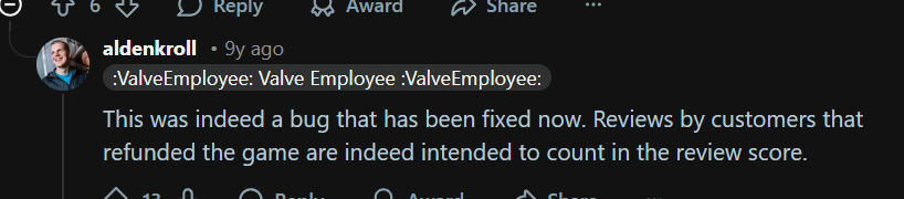 그렇다면 두 가지 반론이 예상될 수 있습니다. 1. "그럼 구매한 유저(purchased user)의 정의가 뭐냐? 산 사람도, 산 적 있었던 사람도 둘 다 해당되는 표현 아니냐?"라는 반론이 가능하지 않겠습니까? 그런데 그 논박으로 스팀에서 다루는 평가 시스템 필터에서 "Who own the game" 라는 항목이 있더군요. "Purchase Type" 필터 설명에 영어권에서는 종종 "Reviews written by customers who own the game on Steam" (스팀에서 게임을 소유한 고객이 작성한 리뷰)라는 표현을 병행 사용합니다. 그 표현에서 Own은 현재 상태를 표현한 단어지, 과거 소유한 경험을 표현한 단어가 아니더군요. 2. 또 다른 반박으로 "그럼 저 위에 올린 스팀 직원의 스샷은 뭣이냐?" 라는 반박이 나올 수 있습니다. 좀 더 확인해 보니,. 저 스팀 직원 댓글의 맥락은 "환불자가 집계에서 빠진다가 버그다" 가 아니라 오히려 반대로 "저 공지가 틀렸다. 실제는 안 그렇더라"는 반박 댓글 여론 사이에서 스팀 직원이 "환불자가 집계에서 빠져야 정상인데, 당신들 말대로 버그가 터져서 그게 적용되고 있지 않는 현상이 간헐적으로 있다"는 맥락의 답변이더군요. 여기까지 찾아본 결론으로, "스팀 정책상, 환불자의 평가는 눈에는 보이지만, 좋/실비 퍼센티지에서는 빠지는 게 맞다" "그러나, 버그로 간혹 그 원칙을 어긋나서 작동하는 경우도 생길 수 있다(님이 올리신 저 2017년 스샷처럼)" 로 수렴할 수 있겠습니다. | 26.03.23 22:41 | | |