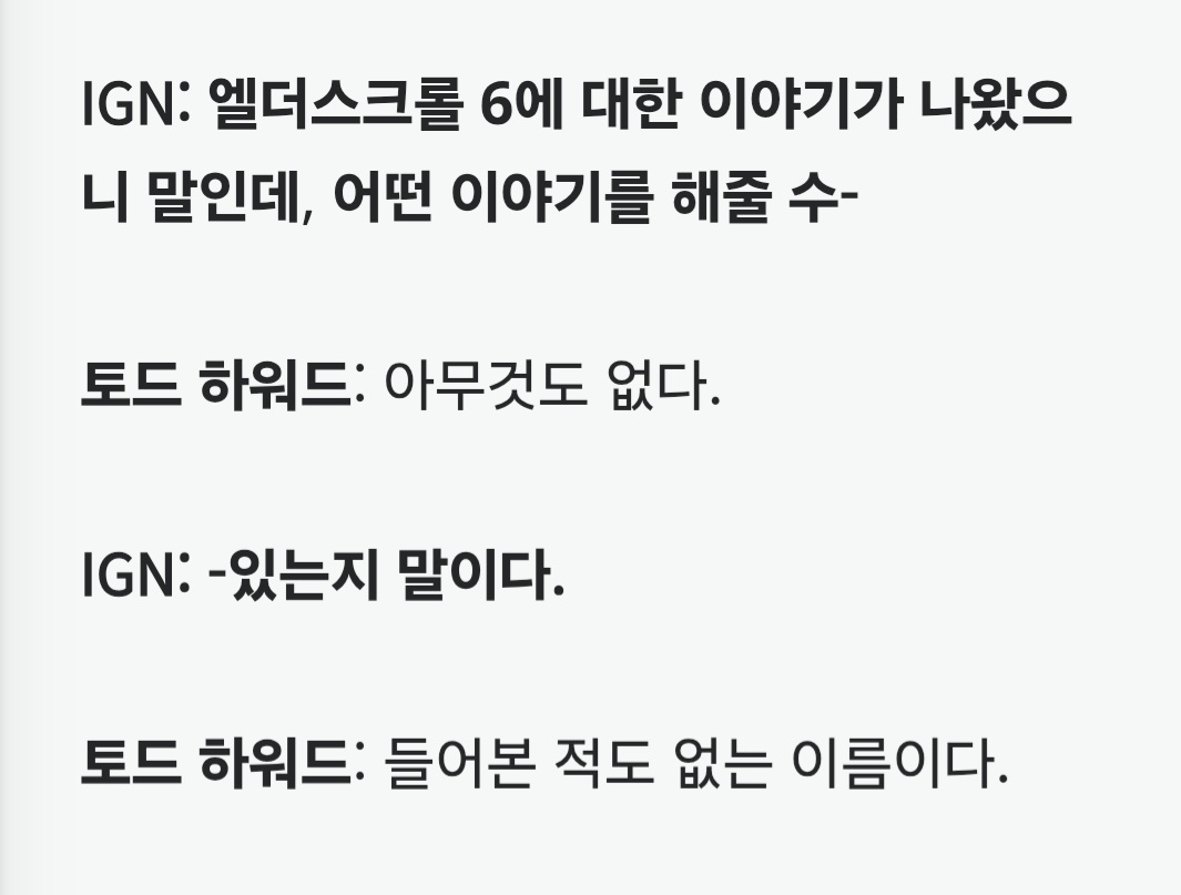 하워드의 이러한 발언은 전 베데스다 디자이너 브루스 네스미스의 말과도 일치합니다. 네스미스는 이전에 팬들이 차기작에 대해 "횃불과 쇠스랑"을 들고 달려드는 분위기였다고 언급한 바 있습니다. 그는 이런 상황이 하워드로 하여금 "네, 엘더스크롤 6 만듭니다. 약속할게요. 진짜로요. 나올 겁니다"라고 말하게 만들었다고 전했습니다.
