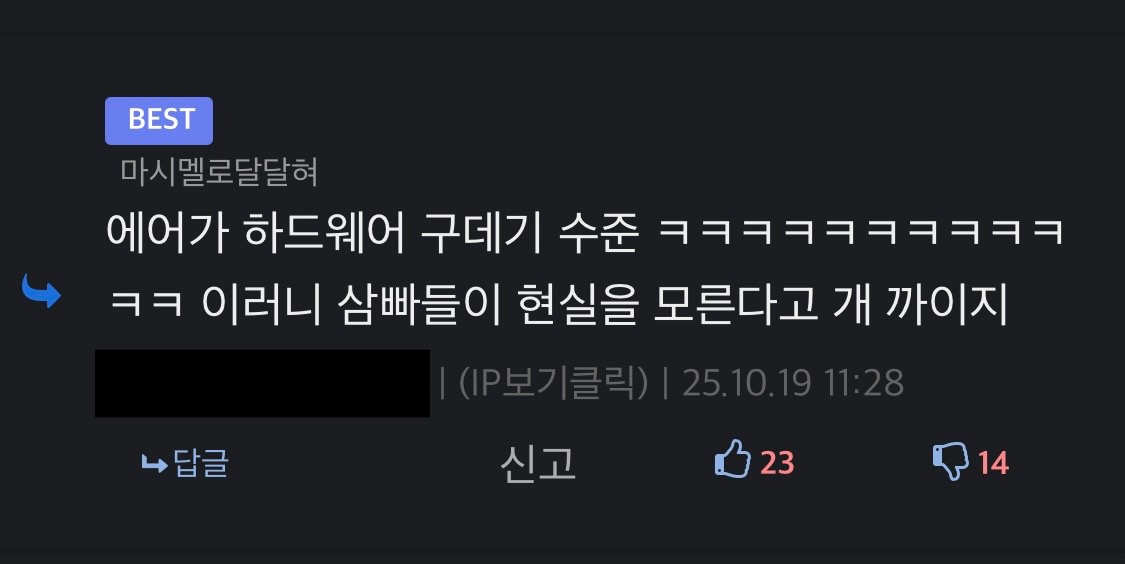 불과 어제만하더라도 에어가 좋다고 한 인간들 여기엔 코빼기도 안보임. 결국 정신승리중~