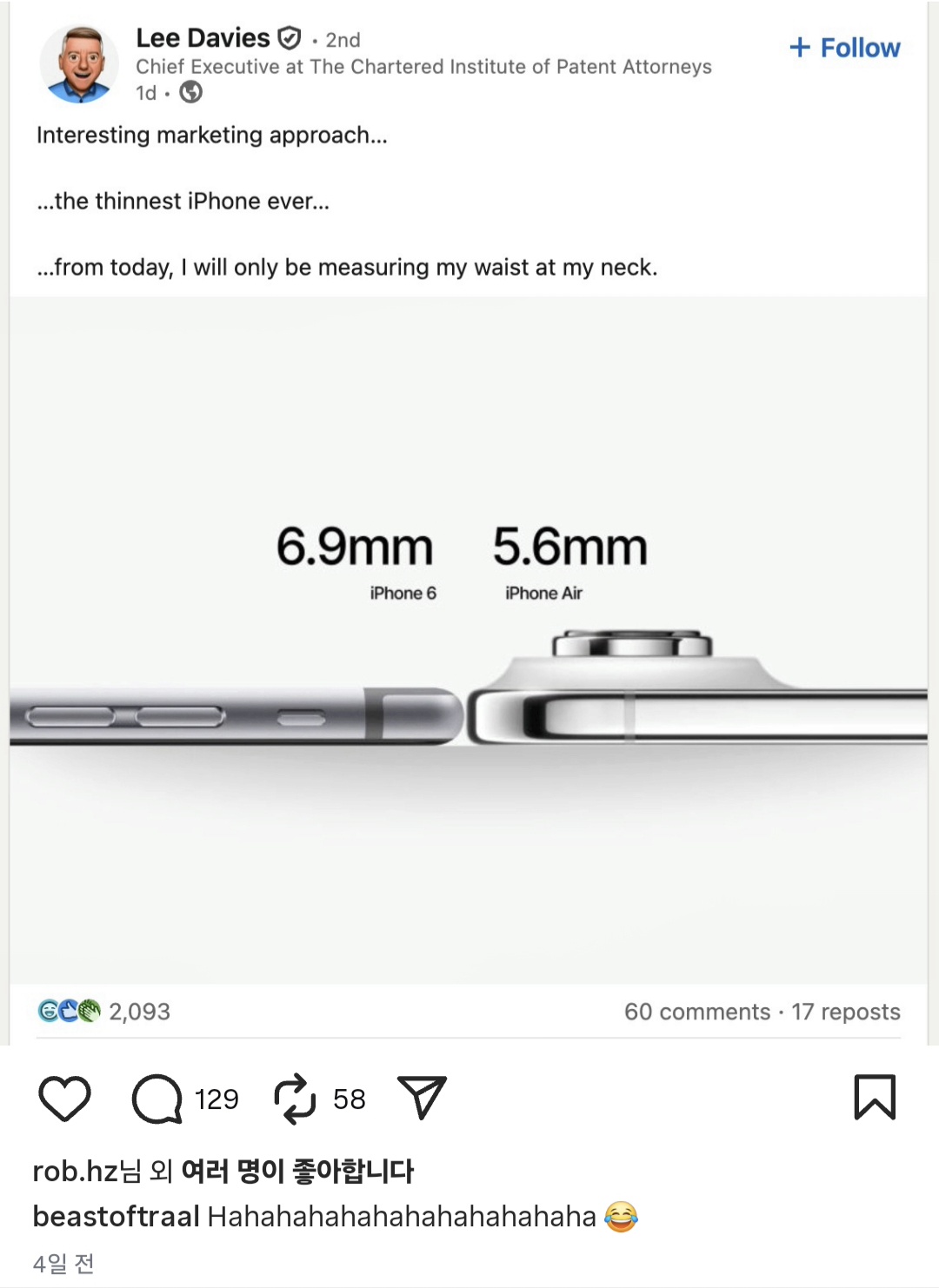 싱글카메라 에휴 그래 가볍고뭐 얇게 하려고 핑계는된다 카메라섬 개 ㅂㅅ같음 17프로도 ㅂㅅ같지만 진짜 싱글카메라를 그따위로 디자인했냐 모노스피커 갤럭시엣지보고 할복해라 진짜 위에 세개만 아니면 당장 아이폰17 안사고 에어샀지