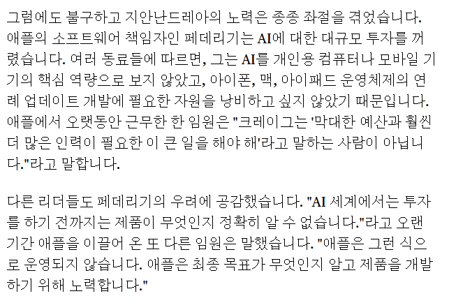 존 지아난드레아가 구글 출신이라 애플 AI 초기 자사 모델이 형편없다는거 알고 AI에 대한 대규모 투자, 또는 구글 AI 를 사서 쓰자는 의견을 냈는데 크레이그 페데리기가 반대함, 정작 AI 실패론으로 떠난건 지아난드레아고 페데리기는 오히려 애플 SW 총괄 책임자가 됨 참...