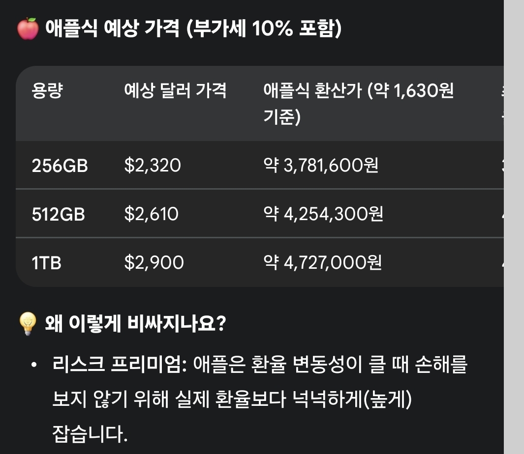 참고로, 현재 애플은 아이폰 17 프로를 256GB, 512GB, 1TB의 세 가지 저장 용량 옵션으로 제공하고 있으며, 아이폰 17 프로 맥스는 2TB 용량 옵션(1,999달러)도 판매하고 있습니다. 위에 표시된 저장 용량별 가격은 현재 환율로 중국 위안화를 미국 달러로 환산한 대략적인 금액이며, 미국에서의 최종 가격을 반영하는 것은 아닙니다. 따라서 대략적인 예상 가격으로 간주하시기 바랍니다.
