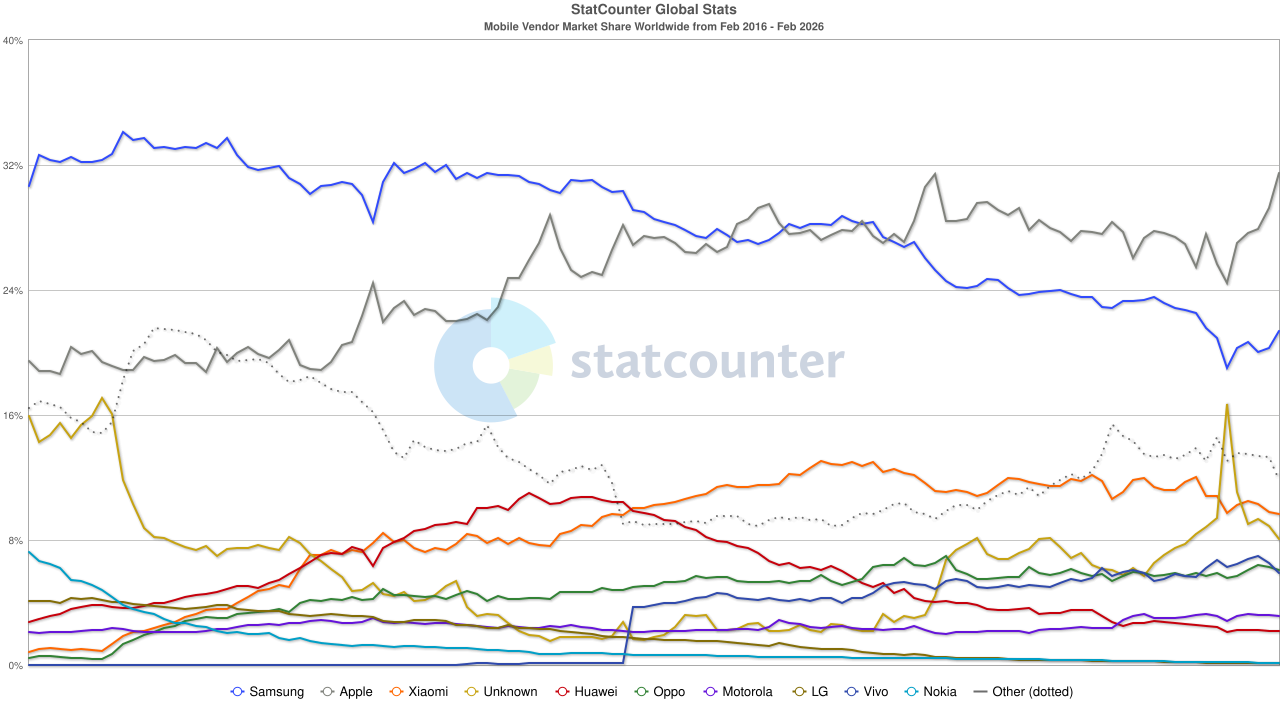 스탯카운터에서 갤럭시 점유율이 본격적으로 하락세를 보이기 시작하던 시기부터 보이던 그 논리네요. 웹트래픽 기준으로 카운팅하는 방식이라 가끔 비정상적으로 수치가 튀는 일은 있어도, "실제로 실사용중인 기기들" 변동추이는 파악하기 좋음. 출하량만 엄청 밀어내는 제조사들한텐 불리한 방식이긴 하지만. | 26.03.29 00:58 | | |